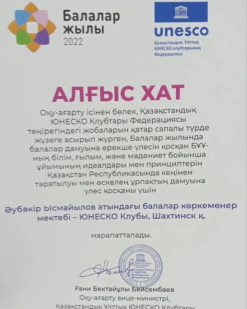 В ходе конференции Детская художественная школа имени А.Исмаилова Клуб ЮНЕСКО была награждена вице-министром образования и науки, вице- президентом Казахстанской Национальной Федерации клубов ЮНЕСКО Ғани Бектайұлы Бейсембаева благодарственным письмом за активное участие в проектах Юнеско, за активную просветительскую и образовательную деятельность среди подростков Министерства просвещения РК.