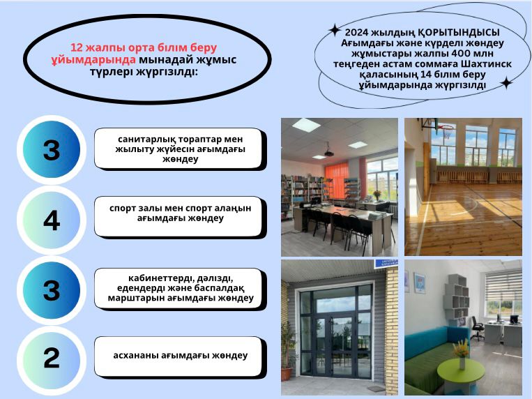 2024 жылы Шахтинск қаласының 14 білім беру объектісінде жалпы сомасы 400 млн. теңгеден астам ағымдағы және күрделі жөндеу жүргізілді.